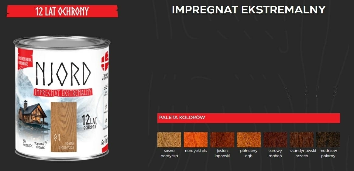 Impregnat Ekstremalny Njord to nowa jakość w ochronie i pielęgnacji drewna. Podkreśla jego naturalne piękno, wydobywając rysunek słojów. Formuła produktu zapewnia bardzo łatwą aplikację, szybkie schnięcie oraz estetyczny wygląd na lata bez efektu łuszczenia się powłoki. Zabezpiecza drewno przed szkodliwym działaniem czynników atmosferycznych, jak promieniowanie UV oraz opady. Dzięki technologii Bio ProtectX tworzy hydrofobową powłokę, odporną również na działanie grzybów i glonów. Opracowany w oparciu o warunki skandynawskie, wzmacnia drewno zapewniając nawet do 12 lat ochrony. W dbałości o zdrowie użytkowników, komfort pracy, a także środowisko naturalne Impregnat Ekstremalny nie zawiera szkodliwych rozpuszczalników.